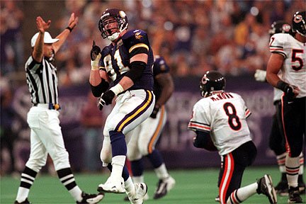 Burrough feiert nach seinem Sack von Bears Quarterback Cade McNown im 3.
