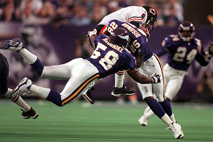 McDaniel (58) und Cris Dishman (25) tackeln Chicagos Quarterback Cade McNown,