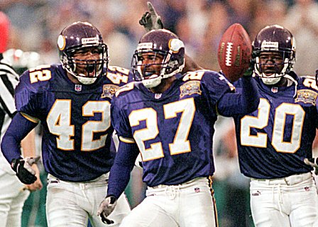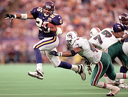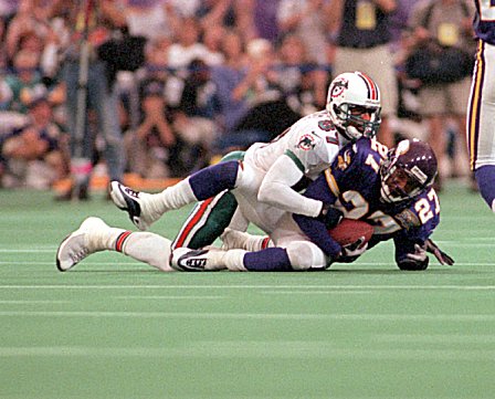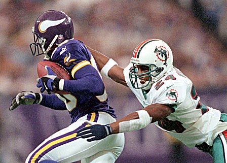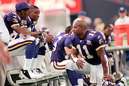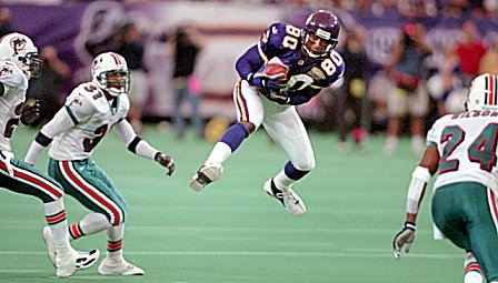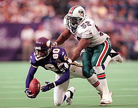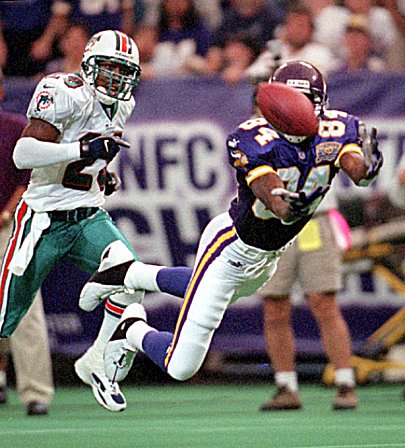 Moss versucht einen Paß von Daunte Culpepper zu fangen.