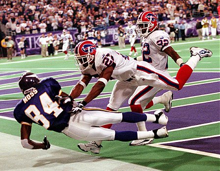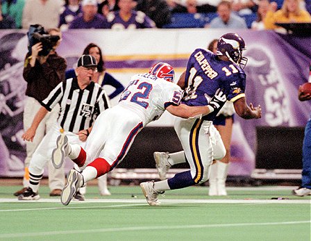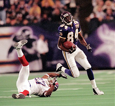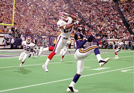 fängt einen Paß von Daunte Culpepper und kann von Bills Cornerback