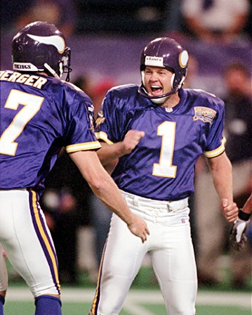 Anderson feiert mit Mitch Berger sein Rekord Feldtor im 4. Quarter.
