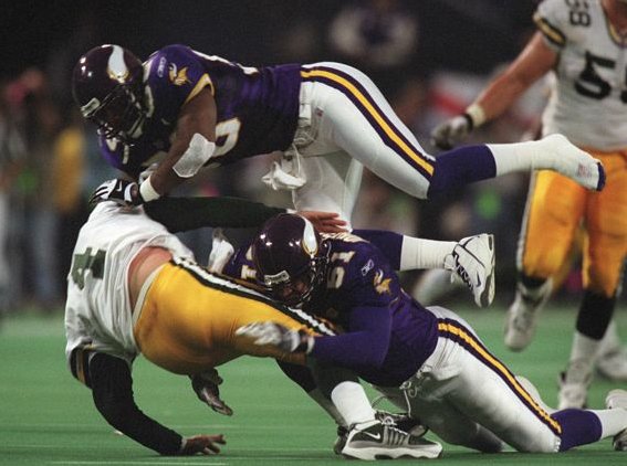 Favre wird von LanceJohnstone und Ed McDaniel getackelt, nachdem er einen