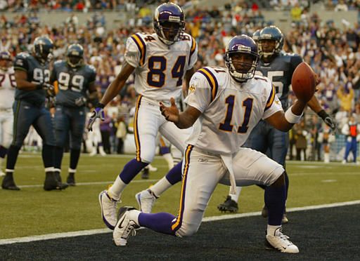 Culpepper feiert mit Randy Moss nach einem 12 Yard Touchdownlauf im 1.