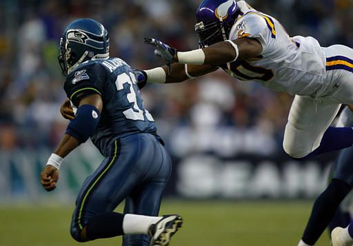 Patrick Chuckwurah kann Seattles Shaun Alexander nicht mehr stoppen.