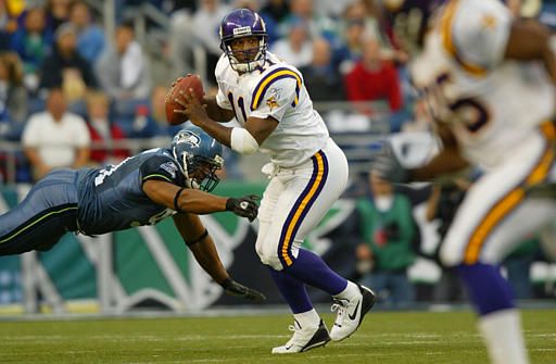 Culpepper wird von Seattle's Anton Palepoi (91) unter Druck gesetzt, während