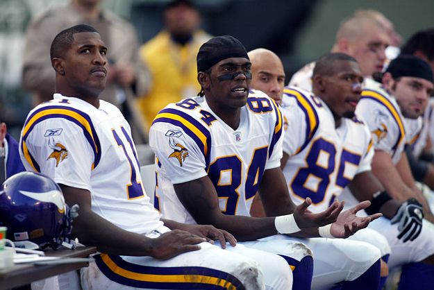 Daunte Culpepper, Wide Receivers Randy Moss und D'Wayne Bates sitzen im