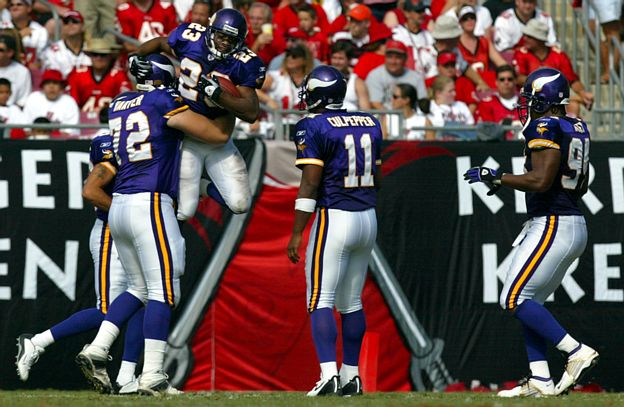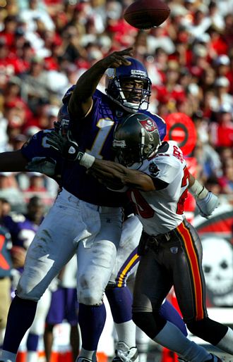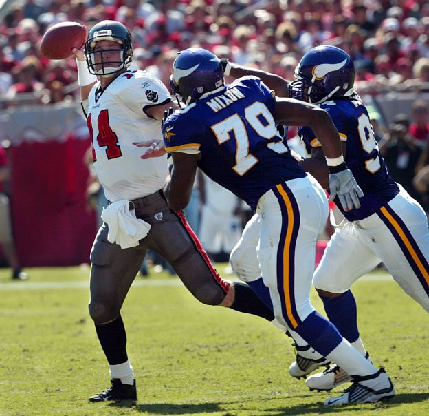 Bays Quarterback Brad Johnson sucht einen freien Receiver, während