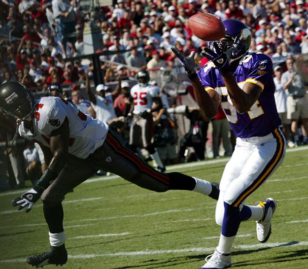 Wide Receiver Randy Moss fängt einen Paß in der Endzone, doch