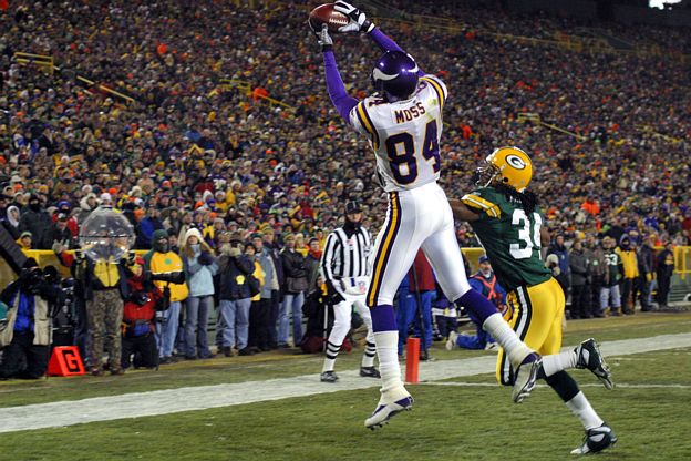 Randy Moss fängt im 1. Quarter einen Touchdownpaß von Daunte Culpepper. Green Bay's Mike McKenzie kommt zu spät und kann nicht mehr eingreifen.