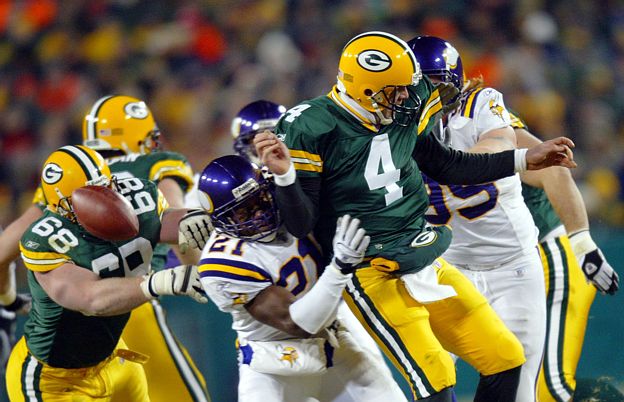 Brett Favre wird gesackt und fumblet den Ball. der von Chris Hovan erobert werden kann.