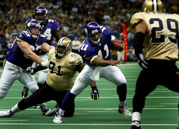 Culpepper kann den Tackles des Saints Defenders Grady Jackson (#91) und
