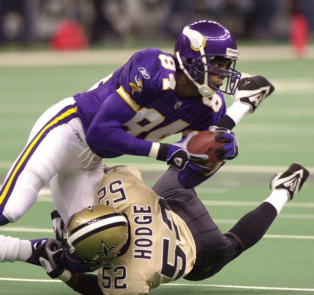 Moss wird von New Orleans Saints Linebacker Sedrick Hodge in der 1. Halbzeit