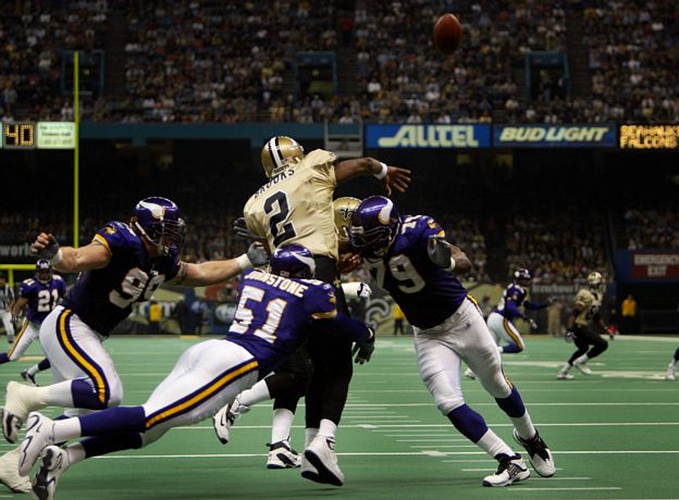 setzen Saints Quarterback Aaron Brooks so unter Druck., daß er keinen