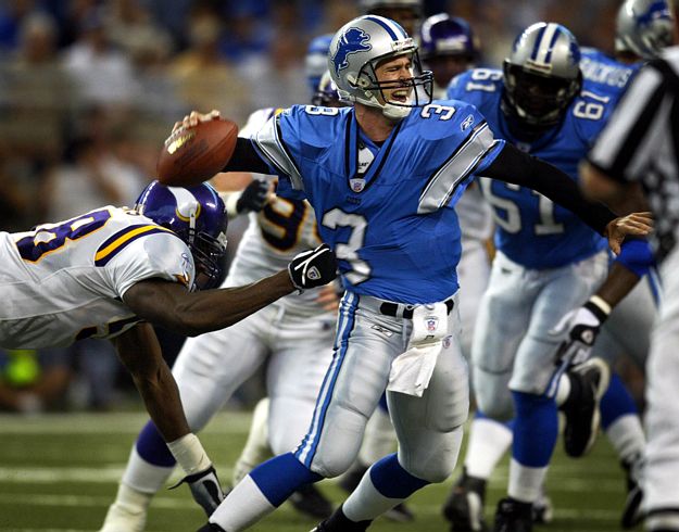Linebacker Nick Rogers setzt Quarterback Joey Harrington unter Druck.