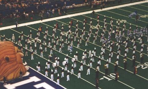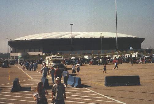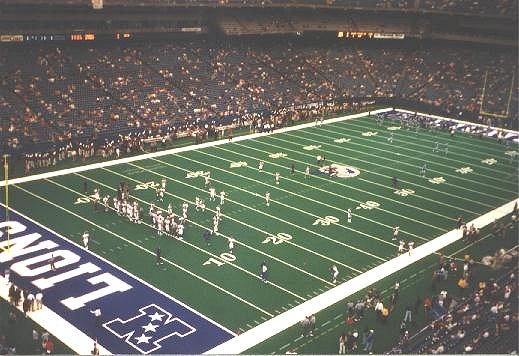 Nachdem ich mein zuvor in Green Bay (!! lol) erworbenes Culpepper-Trikot und die Vikingscap angelegt hatte, schlossen wir uns der vorbeiziehenden Masse an und machten uns auf den Weg zum Dome. Und da wurd's mir dann doch etwas mulmig und ich fragte mich, ob es so klug war, mitten im "Feindesland" meine "Purple Pride" derart zur Schau zu stellen. "Culpepper?? Who the fu**'s that guy?" war noch einer der freundlicheren Sprüche, die ich zu hören bekam. Aber angegriffen hat uns schließlich keiner und meist konnte ich nach den Kommentaren in den Gesichtern derjenigen, die sie geäußert hatten, ein verschmitztes Grinsen entdecken. Also auch alles halb so wild. Auf dem "offiziellen" Parkplatz direkt vor dem Silverdome fiel mir dann auf, dass dort noch eine Menge freier Plätze waren, und erst nach Rückfrage bei einem Einheimischen konnte ich in Erfahrung bringen, dass diese Plätze für "Season Ticket Holder" reserviert sind. Aha, das klang noch logisch. Als mir dann jedoch noch gesagt wurde, dass die Parkgebühr nicht im Preis der Dauerkarte enthalten ist, sondern vom Käufer dieser extra bezahlt werden MUSS (sonst gibt's eben keine Dauerkarte), fand ich dann doch etwas seltsam. Auf dem Parkplatz sah ich dann auch die ersten Vikings-Fans. Gottseidank, dachte ich mir, ganz alleine bist du auf jeden Fall nicht. Und wie das im "Feindesland" dann eben so ist, man hält noch stärker zusammen und wirft sich aufmunternde Sprüche a la "Four'n'O, Brother, Four'n'O!!" (4-0 sollte der Record nach dem Spiel sein) oder "Let's kick some Lions' a**" zu. Es waren sogar erheblich mehr Fans in Purple dort, als ich erwartet hatte (ein Freund, ein gebürtiger Amerikaner, hatte mir einmal erzählt, in Amerika sei es nicht üblich, zu den Auswärtsspielen des eigenen Teams mitzureisen. Bei den teilweise sehr großen Entfernungen ja auch kein Wunder). Ein weiteres, wohl typisch amerikanisches, Phänomen, bekam ich ebenfalls auf dem Parkplatz zu sehen: Wo man hinsah, Menschen mit Lions-Trikots, die um einen Grill herum auf Lions-Klappstühlen saßen, aus Lions-Bechern tranken, auf Lions-Papptellern Steaks oder Würstchen aßen und der Country-Musik aus dem dazugehörigen Wohnmobil mit Lionsfähnchen oder gar Lionsspielern aus Plastik auf dem Dach lauschten. Verrückt, diese Amis, einfach verrückt:-). Ganze Familien scheinen die Heimspiele zum Sonntagsausflug zu nutzen, sie waren morgens schon um 10 da und waren eine Stunde nach Spielende noch lange nicht weg.