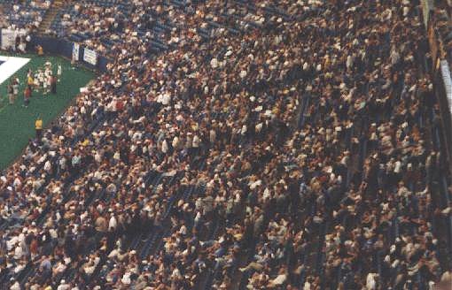 Und dann ging es los: Die Vikings gewannen den Coin Toss und entschieden sich, zuerst anzugreifen. Die Serie endete jedoch mit einem schnellen "3 and out". Beim 2. Down jedoch bekam man schon mal einen Vorgeschmack auf das, was noch folgen sollte. Culpepper warf den Ball tief auf Randy Moss, der der Secondary der Lions entkam und ohne Zweifel einen Touchdown erzielt hätte, hätte Culpepper ihn nicht um einiges überworfen. Im nächsten Drive folgte dann der erste Touchdown der Lions, die sich kontinuierlich über das Feld vorarbeiteten und schliesslich durch einen 9-Yard Pass von Charlie Batch auf Germaine Crowell und den folgenden PAT mit 7:0 in Führung gingen. Der Jubel der Massen war unglaublich, und ich dachte ernsthaft darüber nach, ob es nicht besser gewesen wäre, Ohropax mitzunehmen:-) Aber schon im nächsten Drive wurde das Publikum merklich stiller: Nach einem 14-yard Lauf von Robert Smith zu Beginn des Drives und einem etwas verunglückten End around durch Moss (-1 yds) feuerte Culpepper dann den zuvor noch zu weit geworfenen Pass auf die #84 der Vikings, der vor dem Snap in Motion ging und dann durch die Lions-Secondary schlüpfte. Diesmal passte alles und Moss lief mutterseelenallein für 61Yards zum Ausgleich für die Men in Purple. Unglücklicherweise sprang ich vor Freude auf und dachte nicht daran, ein Foto zu schiessen:-) Aber das wäre wohl eh nichts geworden, da die Vikings auf die von uns entfernte Endzone angriffen.
