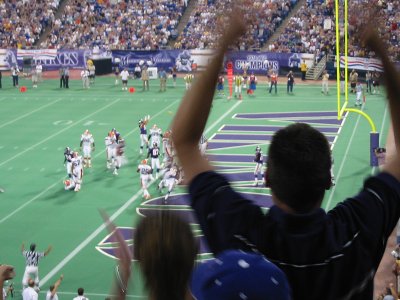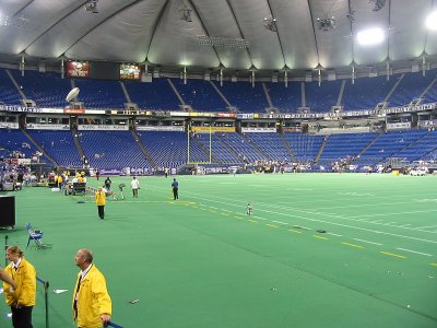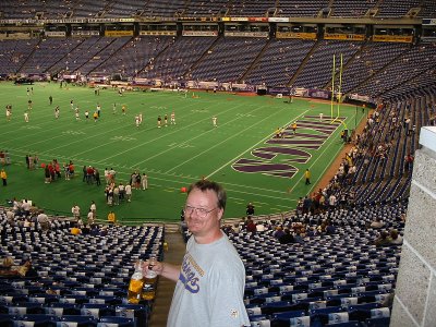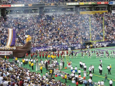 Das Warten wird langsam unerträglich, doch dann ist es soweit. Im Dome wird ein Wikingerschiff aufgeblasen durch das die Spieler in den Dome einlaufen. Angeführt werden sie von Ragnar, dem lebenden Vikings Maskottchen, auf seiner Harley und einigen Fahnenträgern. Unter dem ohrenbetäubendem Lärm der über 63000 Zuschauer geht es dann los und die Spieler werden vorgestellt. Den meisten Applaus erhalten, wie nicht anders zu erwarten, D. Culpepper und R. Moss.Bevor das erste Viertel mit dem Kick Off der Vikings beginnen kann, wird natürlich zuerst einmal die amerikanische Nationalhymne gesungen, wobei mir ein eiskalter Schauer den Rücken runterläuft. Der erste Drive wird ganz klar von der Offense der Browns bestimmt. Die Vikings Defense hat nicht den Hauch einer Chance den Browns Touchdown zu verhindern. Doch jetzt kann auch unsere Offense endlich zeigen was sie kann und wir werden Positiv überrascht, wie gut der erste Anzug der Offense schon passt. Randy Moss ist zwar nicht, wie eigentlich zu erwarten war, der Topreceiver der uns ins Staunen bringt, sondern D'Wayne Bates fängt ein Pass nach dem anderen, doch am Ende schließen die Vikings ihren ersten Drive mit einem Touchdownlauf von Moe Williams ab.